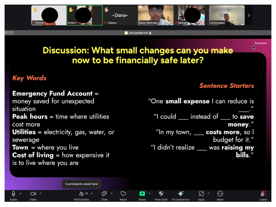 We partnered with Learn and Teach UA, a Ukrainian NGO, to host a 9-week financial literacy course for displaced Ukrainian students lacking access to non-remote education. Through the Ukraine Speaks English initiative, we hosted weekly classes for more than 40 students of all ages—every Saturday in August and September. Topics ranged from simple budgeting rules to international trade, providing valuable experiences for both students and the Edunomix team members who volunteered.